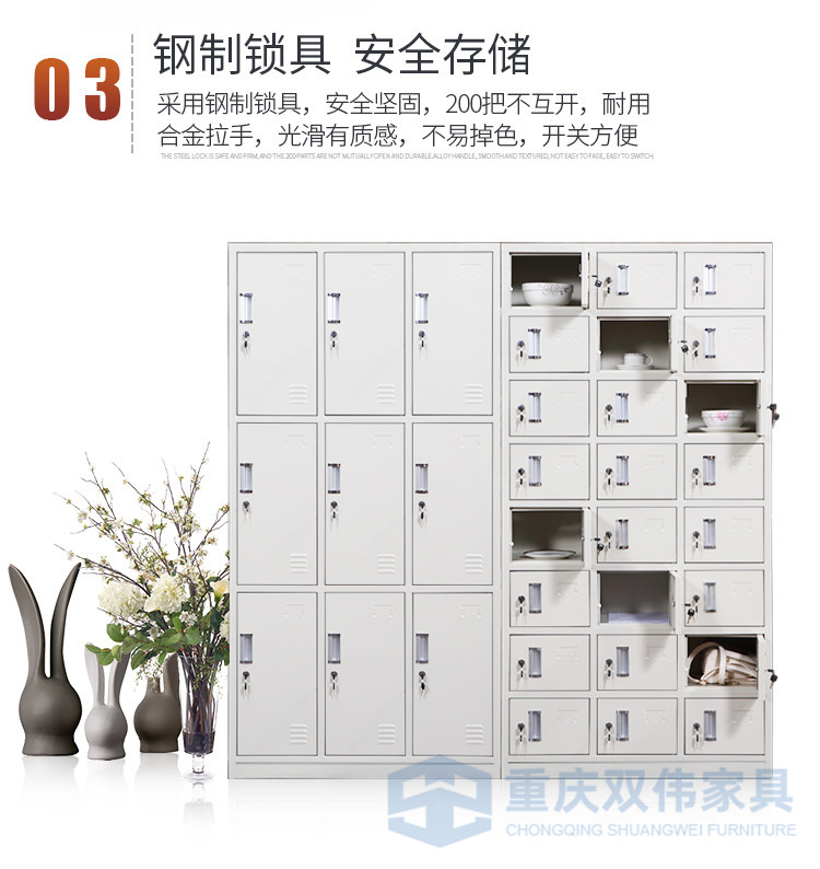 ·上部对开2门(配PVC内嵌扣手/转舌锁),内置1块可调隔板(2个存储空间),配隔板卡扣;下部左侧立式6抽屉(双壁前面板,配全宽天鹅颈扣手/连杆锁/号插,抽屉侧板配尼龙脚轮);下部右侧1门配PVC内嵌扣手/转舌锁,门背焊接全长加强筋,内置1块可调隔板(2个存储空间),配隔板卡扣;