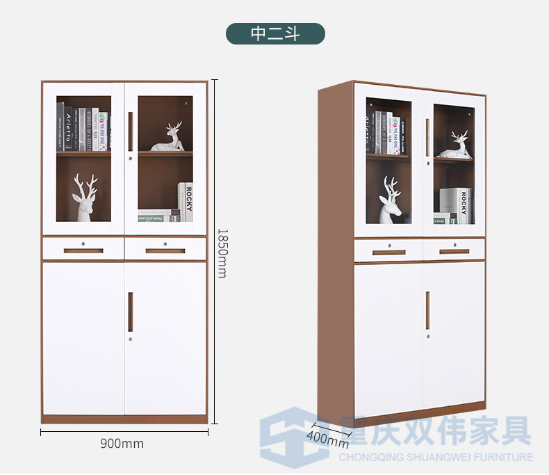 ·上部2个玻璃移门,内置1块可调隔板(2个存储空间),配隔板卡扣;下部左侧立式6抽屉(配连杆锁,双壁前面板,侧板两侧配尼龙脚轮),右侧1门配PVC内嵌扣手,转舌锁,门背焊接全长加强筋,门内配1可调隔板;